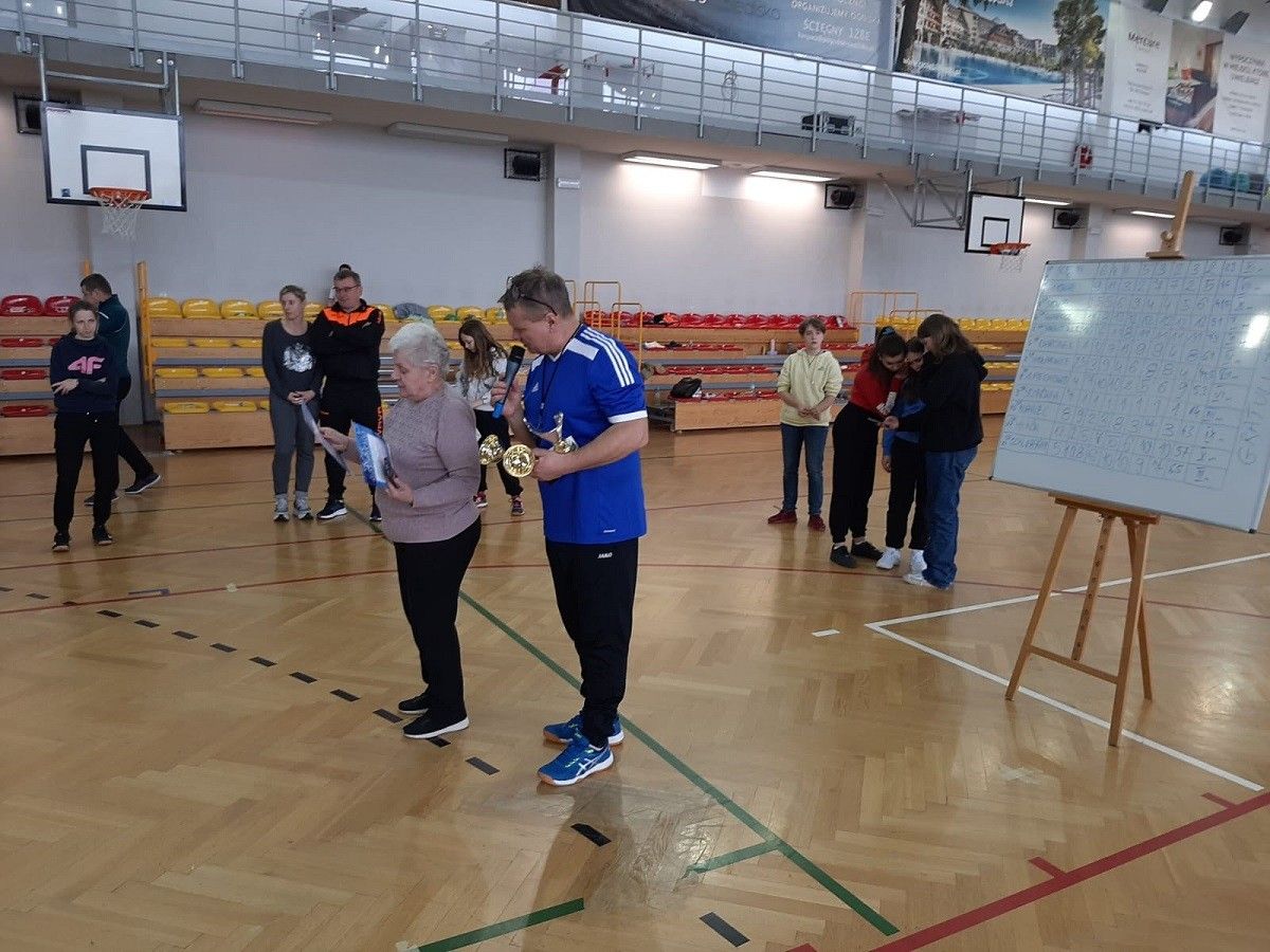 Nauczyciele wf: Małgorzata Sokół-Zięba, Piotr Lesiński. Podziękowania dla Pana Bogusława Kutryby za pomoc w przygotowaniu uczniów do zawodów.