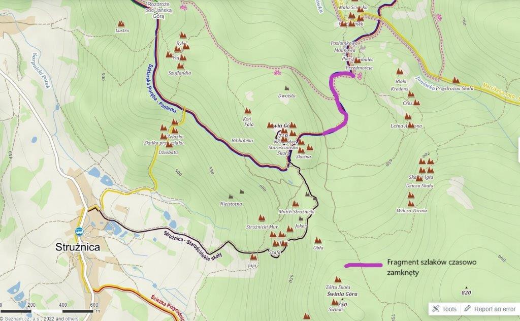 Nadleśnictwo „Śnieżka” informuje o czasowym zamknięciu odcinków szlaków rejonie szlaku pieszego niebieskiego oraz rowerowego prowadzącego ze Starościańskich Skał (Lwiej Góry) w kierunku skałek Piec i Skalny Most.