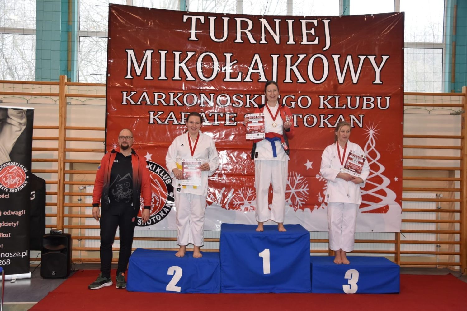 W minioną niedzielę w hali sportowej Szkoły Podstawowej w Janowicach Wielkich odbył się III TURNIEJ MIKOŁAJKOWY. Organizatorem był Karkonoski Klub Karate Shotokan. Patronat nad zawodami objął Wójt Gminy Janowice Wielkie Pan Kamil Kowalski. W zawodach wzięło udział prawie 100 młodych karateków z 7 klubów z Dolnego Śląska oraz jednego z Czech. W sumie rozegrano 64 konkurencje kata (układy ruchów), kumite (walka sportowa ), kihon (podstawowe techniki karate) oraz fantom (walka z manekinem treningowym. Łącznie ponad 200 osobo-konkurencji pod okiem sędziów Polskiej Unii Karate z sędzią światowym WKF Pawłem Piotrowskim. Świetnie spisali się zawodnicy KKKS wygrywając zdecydowaną większość konkurencji. Turniej był przede wszystkim okazją do pierwszych startów dla najmłodszych zawodników, a dla dłużej trenujących okazją do zaprezentowania swoich umiejętności przed własną publicznością. Pierwszy raz na mikołajkach rozegrano również konkurencje dla dorosłyc, którzy dopiero rozpoczęli przygodę ze sztukami walki. Każdy uczestnik wrócił z medalem oraz paczką od Świętego Mikołaja. Na miejscu było ogólnodostępne stoisko gastronomiczne przygotowane przez rodziców zawodników i członków klubu. Turniej zorganizowano przy wsparciu ze środków Gminy Janowice Wielkie oraz lokalnych sponsorów.