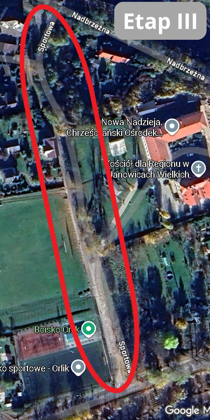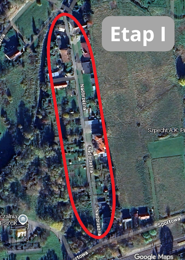 W pierwszej kolejności prace prowadzone będą na ul. Nadbrzeżnej. Roboty realizowane będą etapami, obejmującymi kolejne odcinki ulicy (szczegółowy podział przedstawiono na załączonych fotografiach).